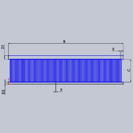 | Mặt hàng | Chiều dài (A) | Chiều rộng (B) | Chiều cao tổng | Chiều cao vây (C) | Độ dày D1 | Độ dày D2 | Khoảng cách vây (E) | Độ dày vây (F) |